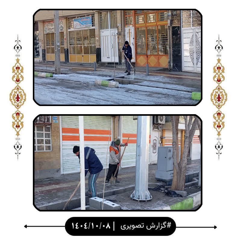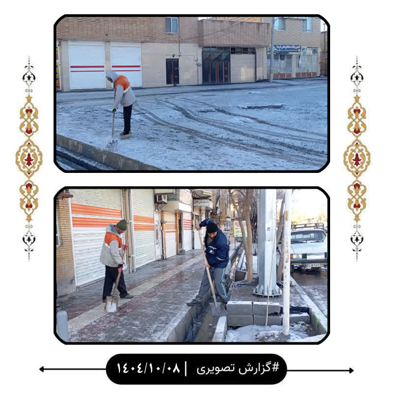 همزمان با پاشیدن مواد ضدیخ، عملیات تراشیدن یخ و برفروبی پیادهروها نیز انجام میشود تا مسیرهای دسترسی به معابر و خیابانها همواره باز و قابل استفاده باشد.